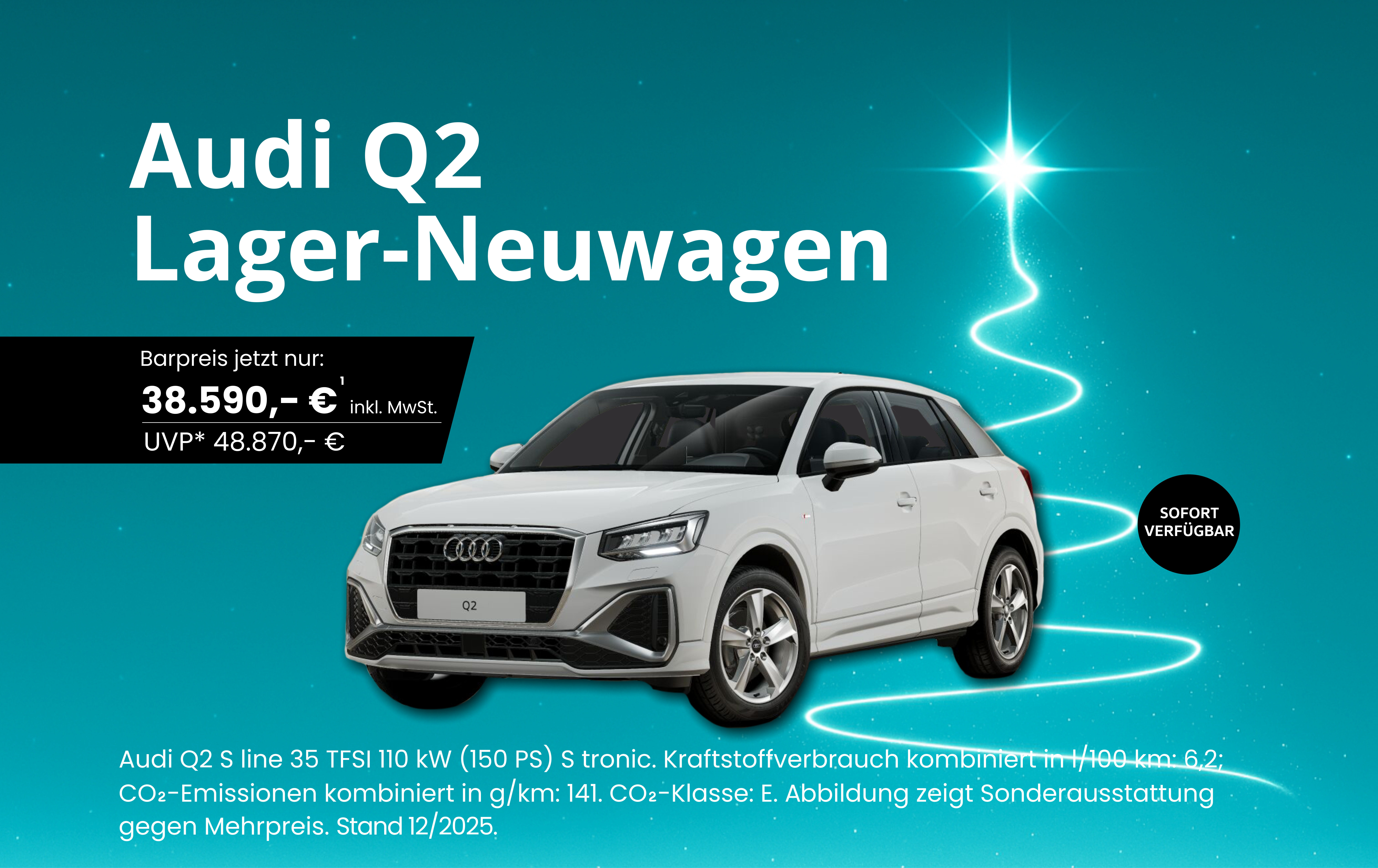Audi Q2 S line 35 TFSI 110 kW (150 PS) S tronic. Kraftstoffverbrauch kombiniert in l/100 km: 6,2; CO₂-Emissionen kombiniert in g/km: 141. CO₂-Klasse: E. Abbildung zeigt Sonderausstattung gegen Mehrpreis. Stand 12/2025.