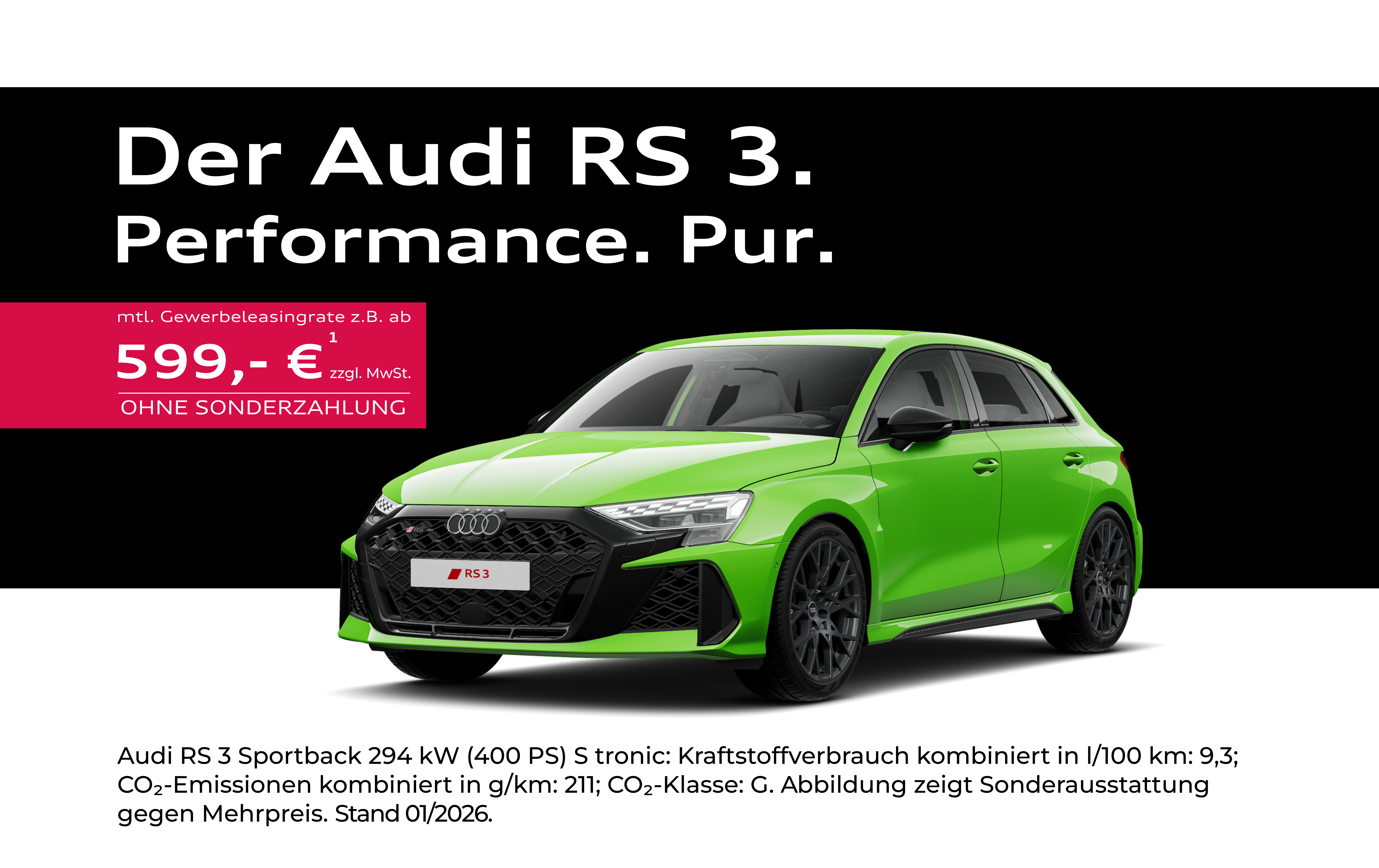 Audi RS 3 Sportback 294 kW (400 PS) S tronic: Kraftstoffverbrauch kombiniert in l/100 km: 9,3; CO₂-Emissionen kombiniert in g/km: 211; CO₂-Klasse: G. Abbildung zeigt Sonderausstattung gegen Mehrpreis. Stand 01/2026.